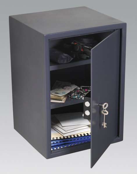 Additional Information:• Heavy-duty steel construction with twin locking bolts. • Powder coated finish to help prevent corrosion. • Compact design, pre-drilled holes and security fixings allow safe to be fixed to the floor or to the wall and hidden away discreetly. • Includes two shelves to help utilize the area inside the safe. • Supplied with two keys. • Size: 350 x 330 x 500mm. • Model No. SKS04