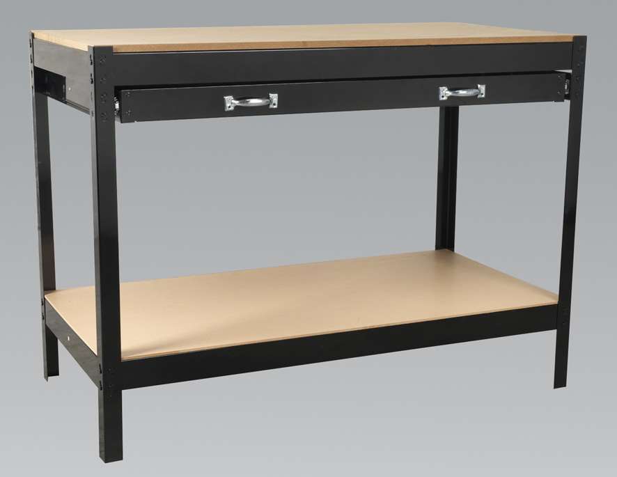 • Boltless design makes the unit easy to assemble, with minimal tools being required.• One large drawer with ball bearing slides, fitted with two handles.• MDF Worktop measures 1210 x 605mm (W x D), which has a comfortable work height of 900mm.• Maximum Capacity per Level: 100kg (Evenly distributed).• Fitted with anti-slip foot protectors.• Model No. AP12160
